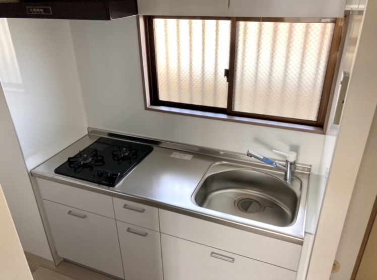 最後はキッチンです。新品のシステムキッチンを取り付け白のキッチンパネルを取り付けました。