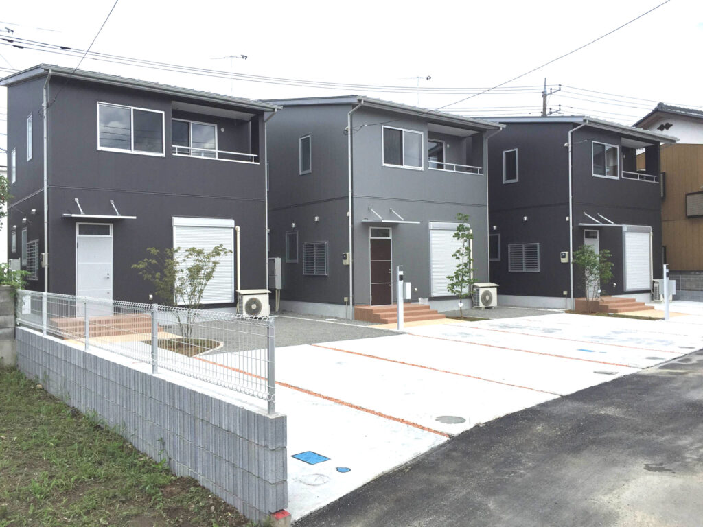 ご覧のとおり、駐車スペースとお庭はきちんと外構工事が行われており、マイホームのような感覚で生活できる賃貸物件になります。