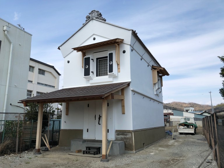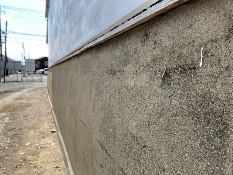 こちらは、腰巻(蔵の1階下部分)の土壁を左官屋さんに塗っていただいた時の写真です。