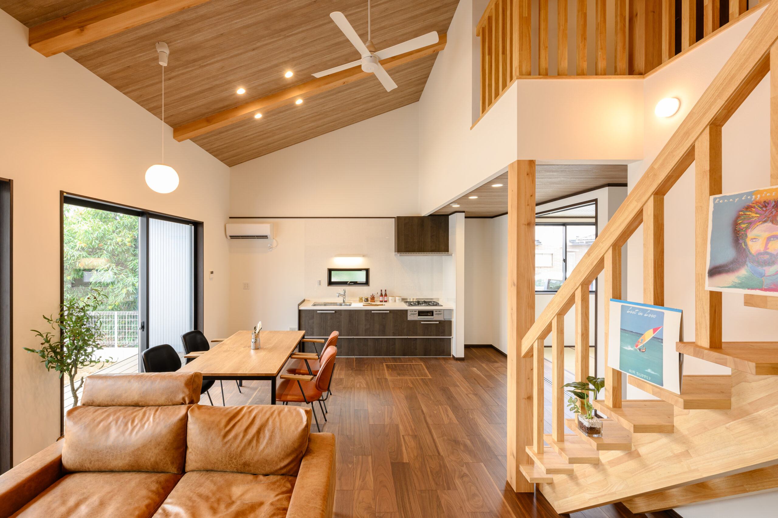 約20帖のLDKすべてが吹き抜けで、どこまでも開放的な集いの空間を設計。さらに、化粧梁やリビング階段で木の温もりを感じながら、いつも笑い声がこだまする家族の時間を生み出します。