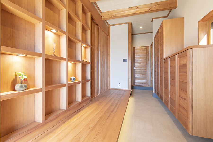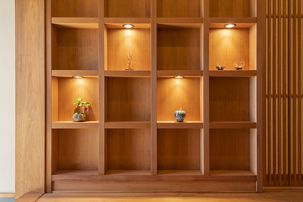 設計士・現場監督・熟練の大工職人がチームを組み、図面の段階から仕上げまでコミュニケーションを重ねて実現した細部の納まり。扉や造作家具のスムーズな開閉感、ぴたりと合った木目合わせなど、技術の結晶を体感してください。