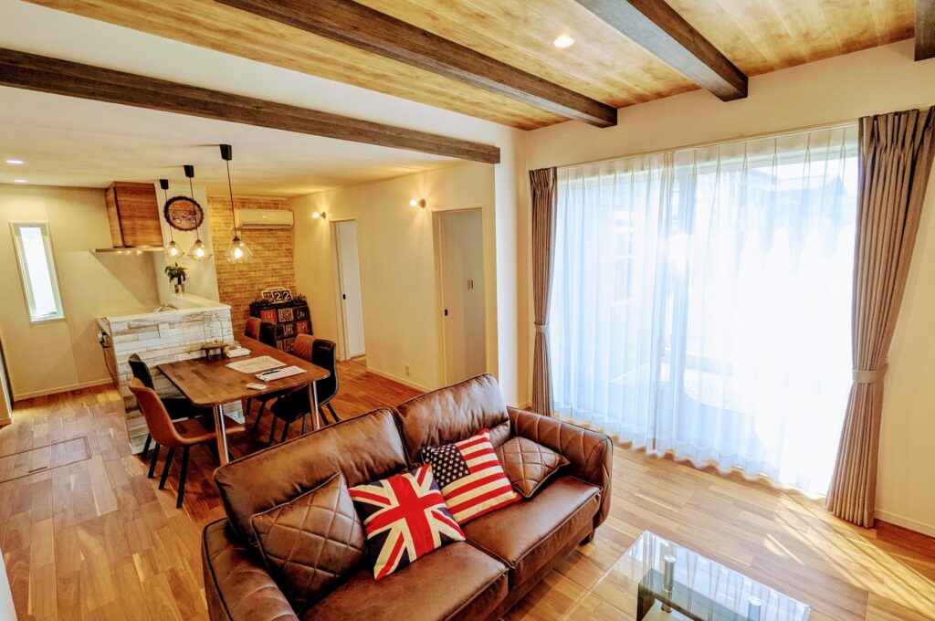 大きな窓から光が射し込む明るいリビングは、天井の梁がアクセントとなり、空間に立体感とデザイン性をプラスした家族が自然と集まる居心地のよいリビングです。