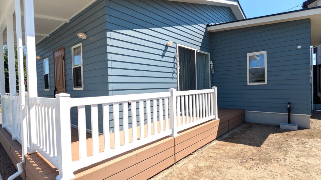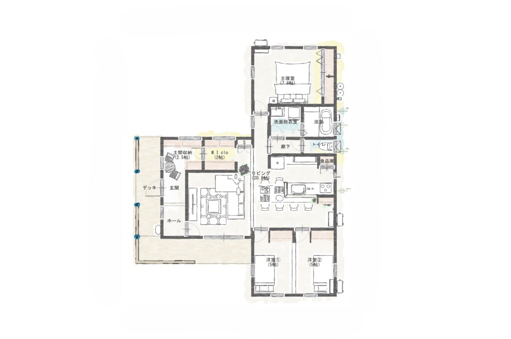 玄関からリビングまで続くフラットデッキは室内と屋外をシームレスに結ぶ場所に。テーブルや椅子を置いてお庭を眺めながらのんびり過ごしたり、外と中の境界線を曖昧にすることで、暮らしがもっと自由に広がります。