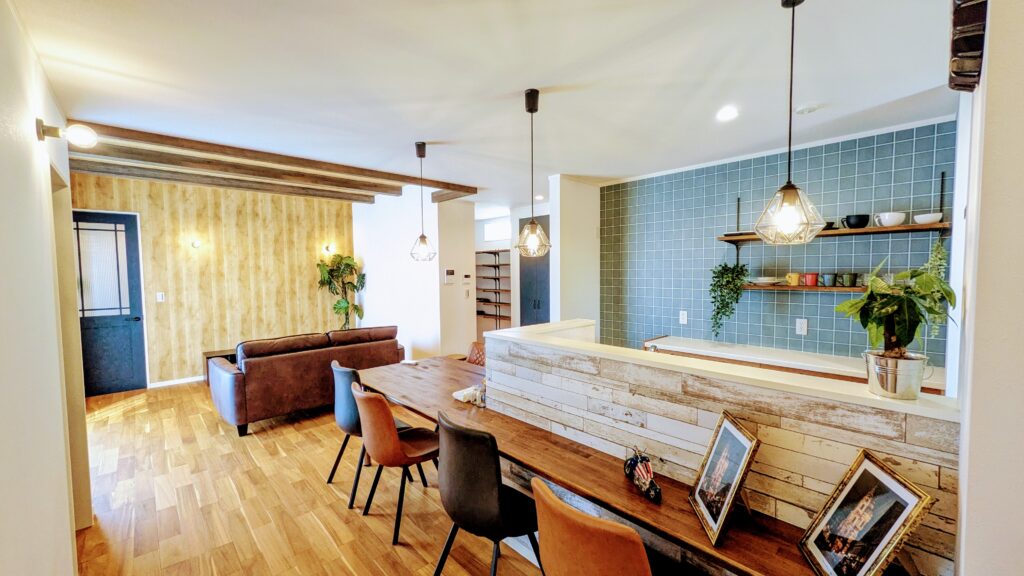ナチュラルな木目とタイル風のクロスを組み合わせた、カフェのようなキッチンには、スタディスペースも、趣味やワークスペースなど用途多彩です。造り付けのカウンターとダイニングテーブルは食事の時間だけでなくお子様の勉強机としても活躍します。