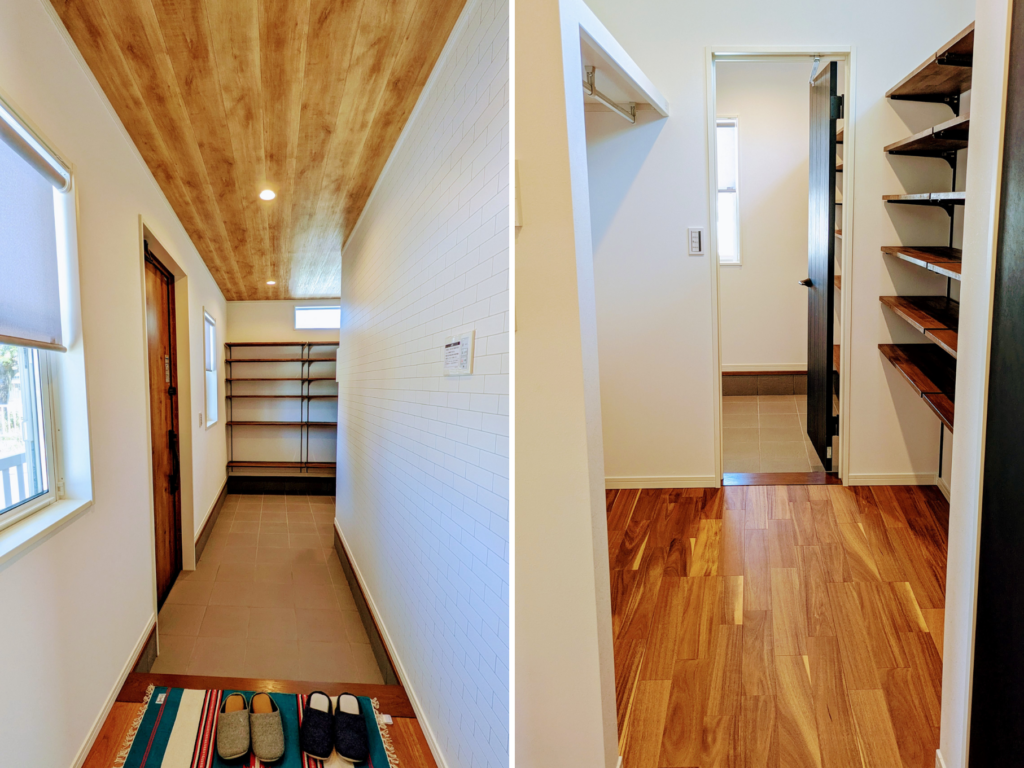 玄関からキッチンを繋ぐ2パターンの動線は家族の動きと家事動線を考慮した間取りです。土間収納から直接ファミリークローゼットに繋がる裏動線は買い物後の収納作業もラクラクに。