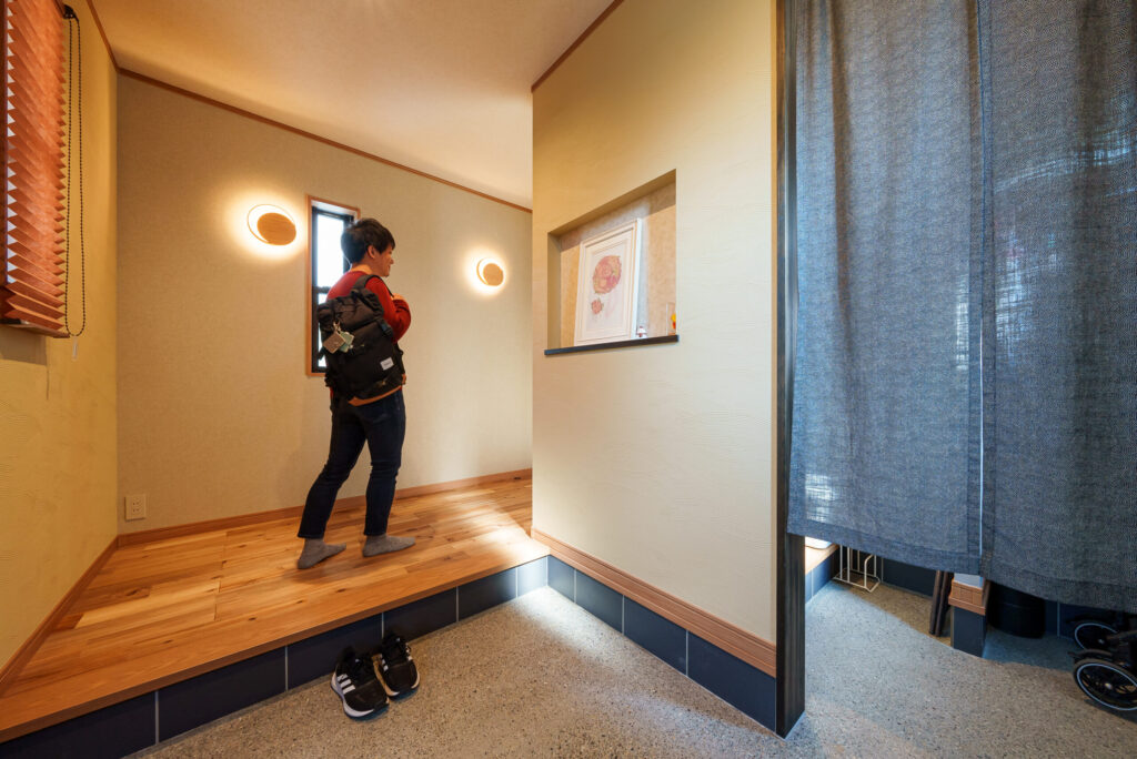 「普段は単身赴任なので週末家に帰るのが楽しみになりました!」と語る旦那様。帰宅して玄関を開けるとやさしい壁色の空間と木の香りで「あぁ、帰ってきた」とほっとするそうです。