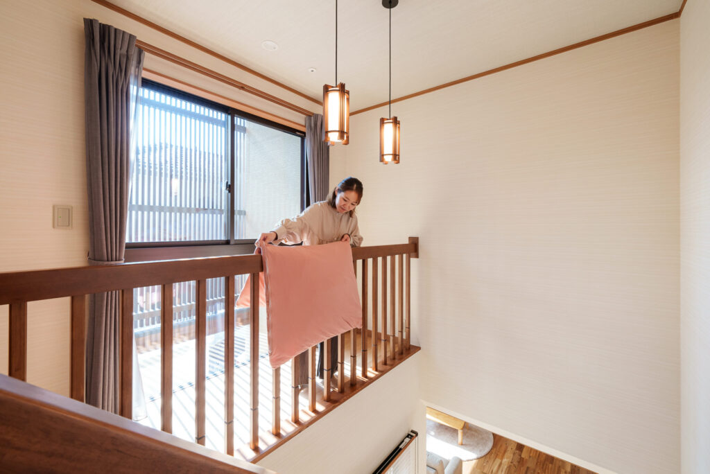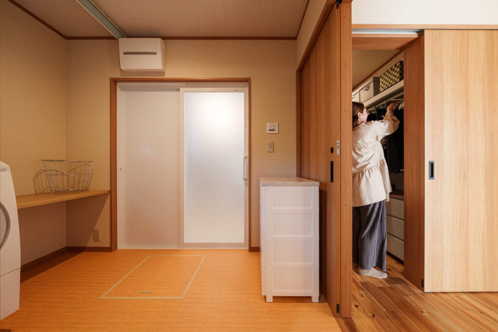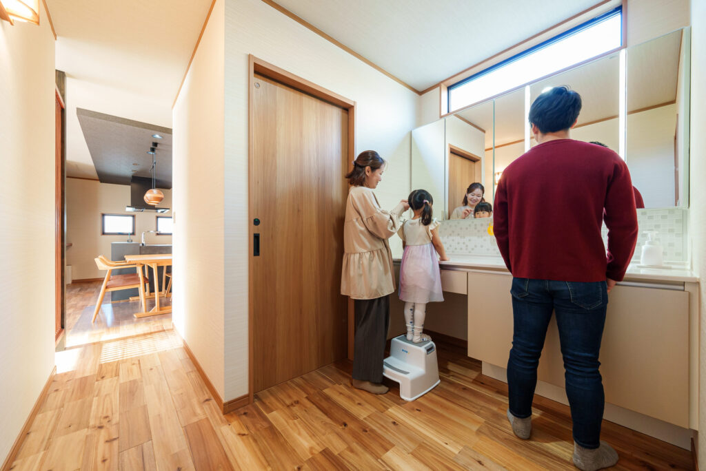 毎日こなす家事だからこそ効率的に行いたいもの。奥様のご要望でランドリールームの隣にウォークインクローゼットを配置したことによって、洗濯物を運ぶ手間が省け短い動線で家事をこなすことが出来ます。他にも、天気を気にせず洗濯物を干せるよう二階吹き抜け部分がサンルームの役割をはたしており、見た目だけではなく実用性も兼ね備えています。「水回りには特に力をいれましたね」と旦那様。洗面台や風呂場もゆったり使用できるようになっています。