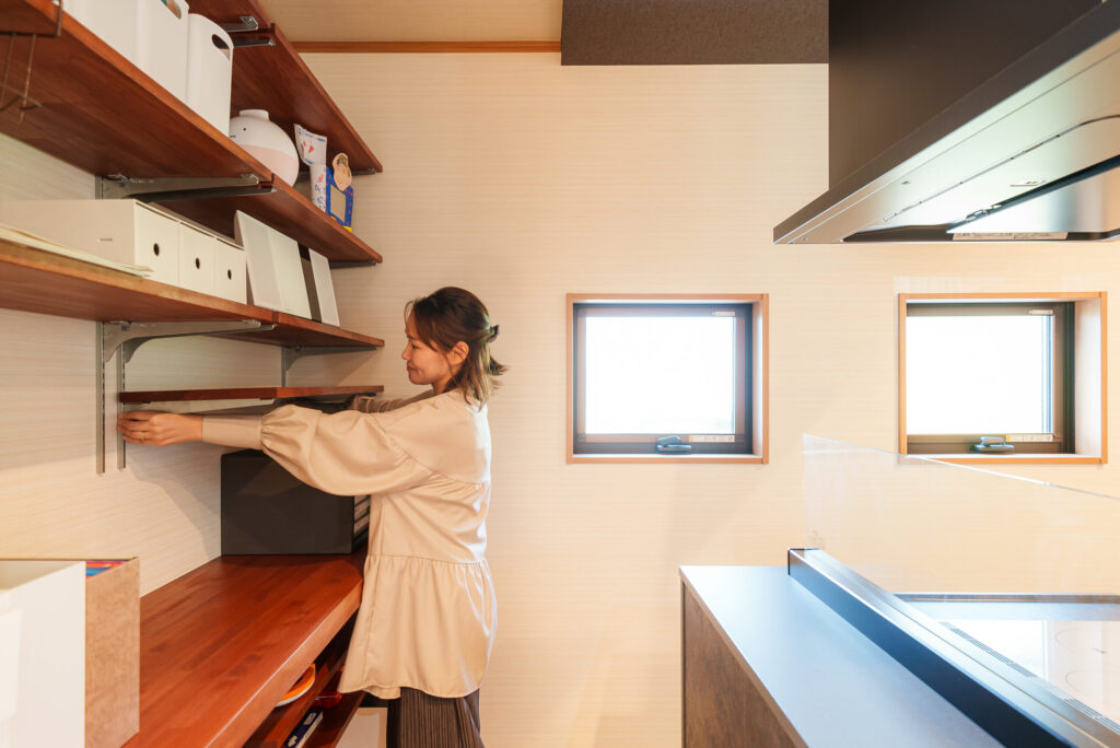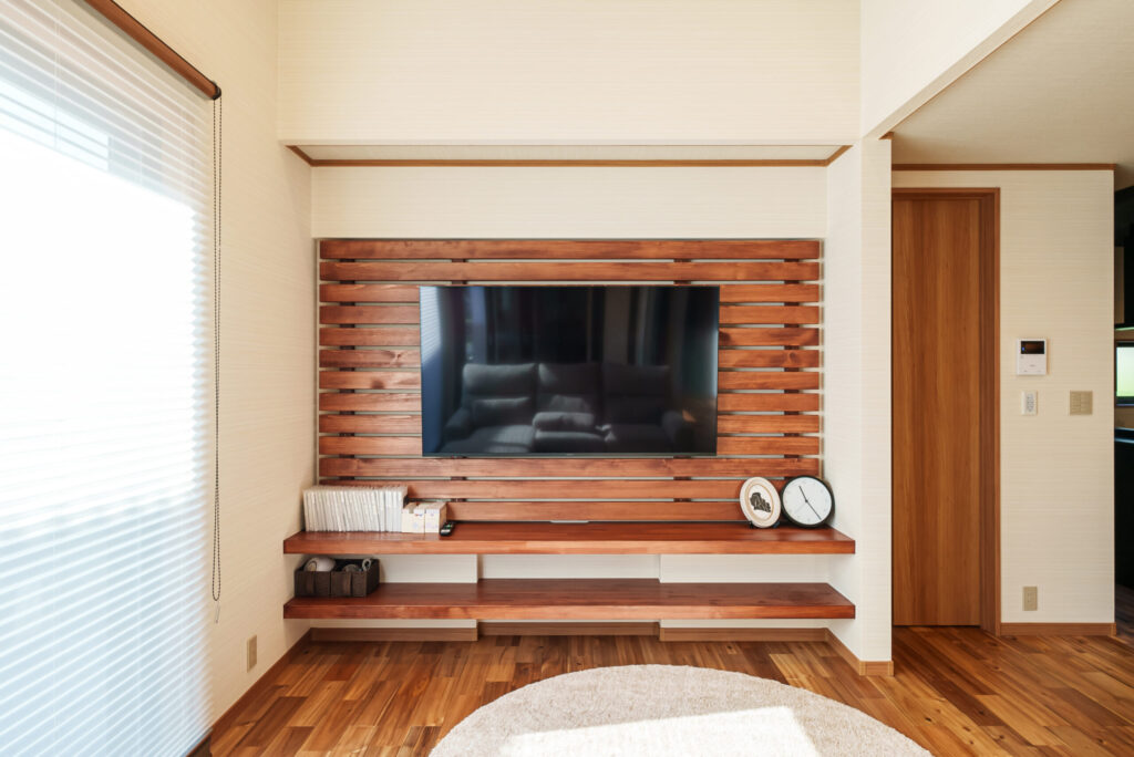 職人さんならではの技で作成された造作家具。S様邸にも随所に施されています。旦那様のお気に入りはテレビボード。柵状に貼られた木材がリビングのアクセントになっています。また、各所に設けられた収納用の棚も、別の収納棚で使用できるよう工夫されています。