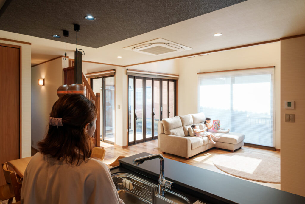 家づくりが始まり、「家の形や間取りを決めるのに悩んでしまったときも、何度も何度も親身になって相談に乗ってくれて凄く心強かったです」と旦那様。インターネットで探して気に入ったものを取り付けたいと相談した際も、設置可能かどうかを一緒に確認してくれたり、「設計士」や職人からもプロ目線で色々とアドバイスや提案をしてもえたのが嬉しかった」とのことです。リビングのエアコンもその一つ。一般的な壁掛けエアコンではなく、広い空間に合った天井埋め込み型のエアコン一台にすることで壁面がすっきりし、家電でお部屋の雰囲気を損なうことがありません。