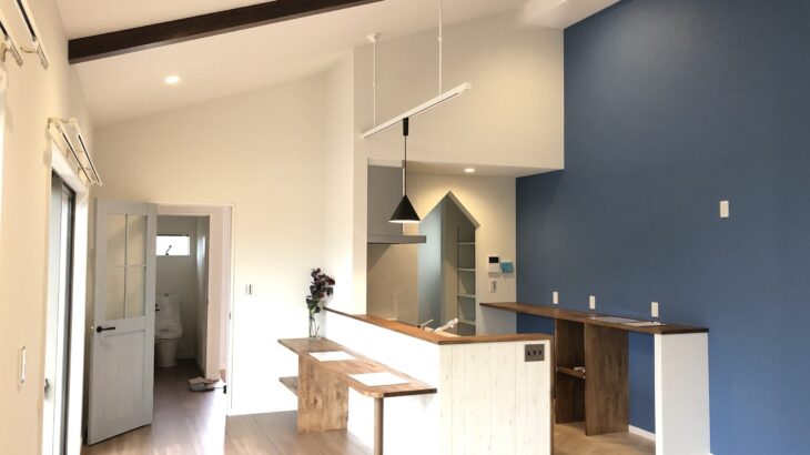 天井の高いリビングは化粧梁をアクセントにした広々空間。開放的なキッチンとの統一感…
