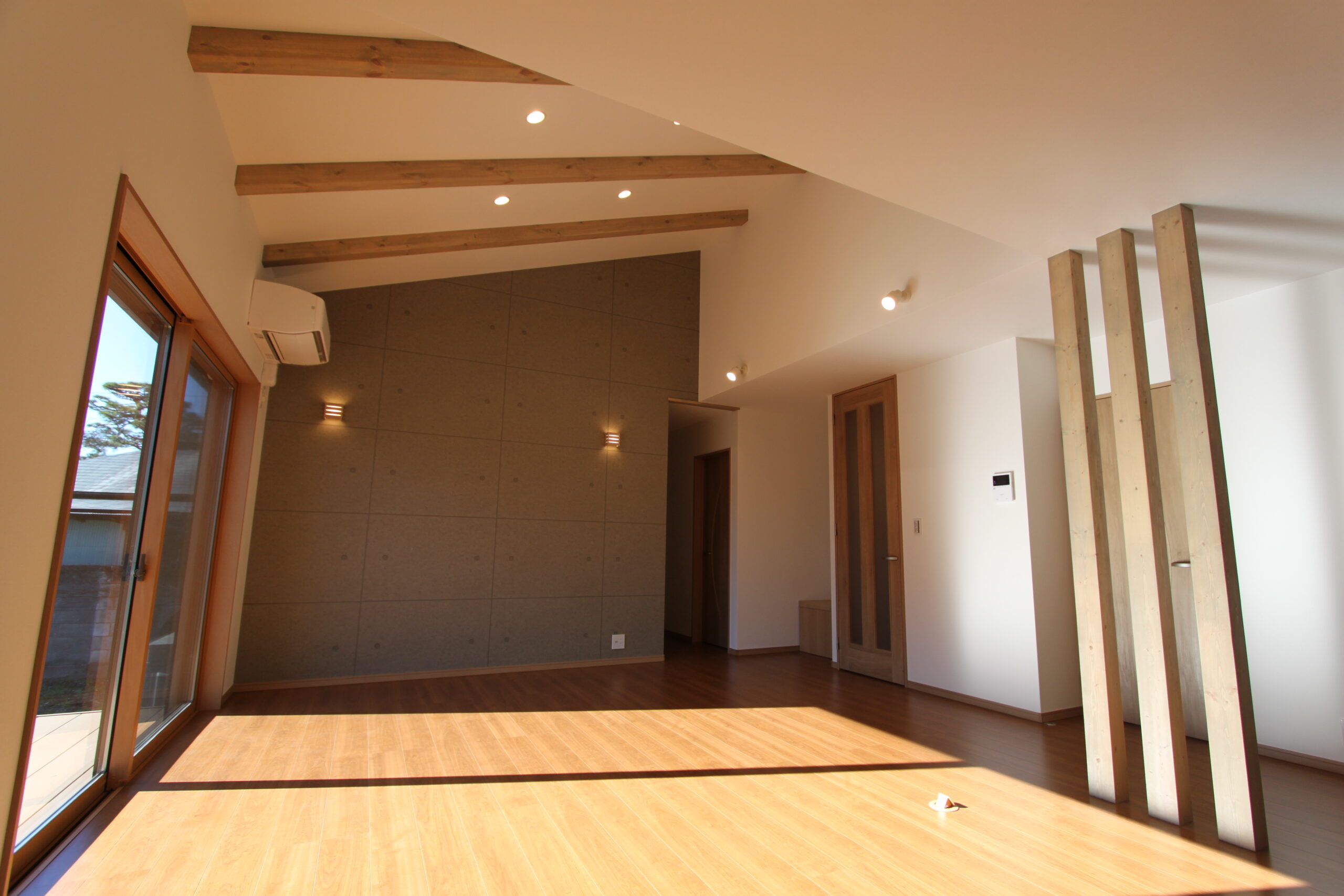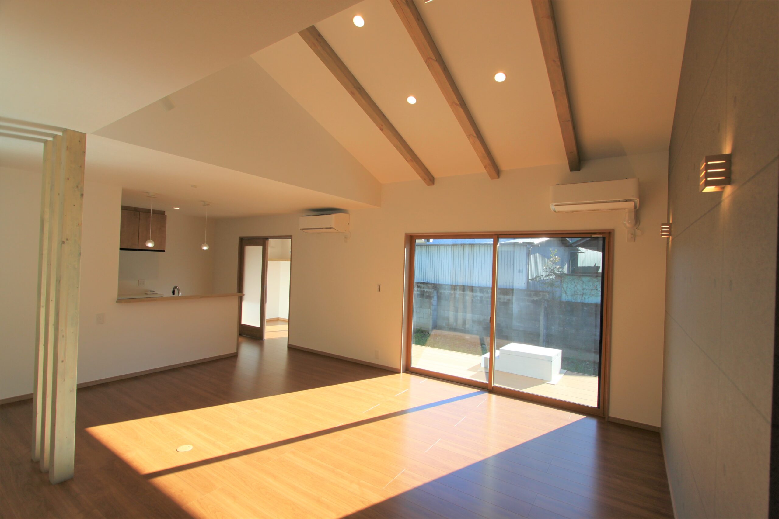 開放感がある勾配天井が特徴的な寛ぎの住まい