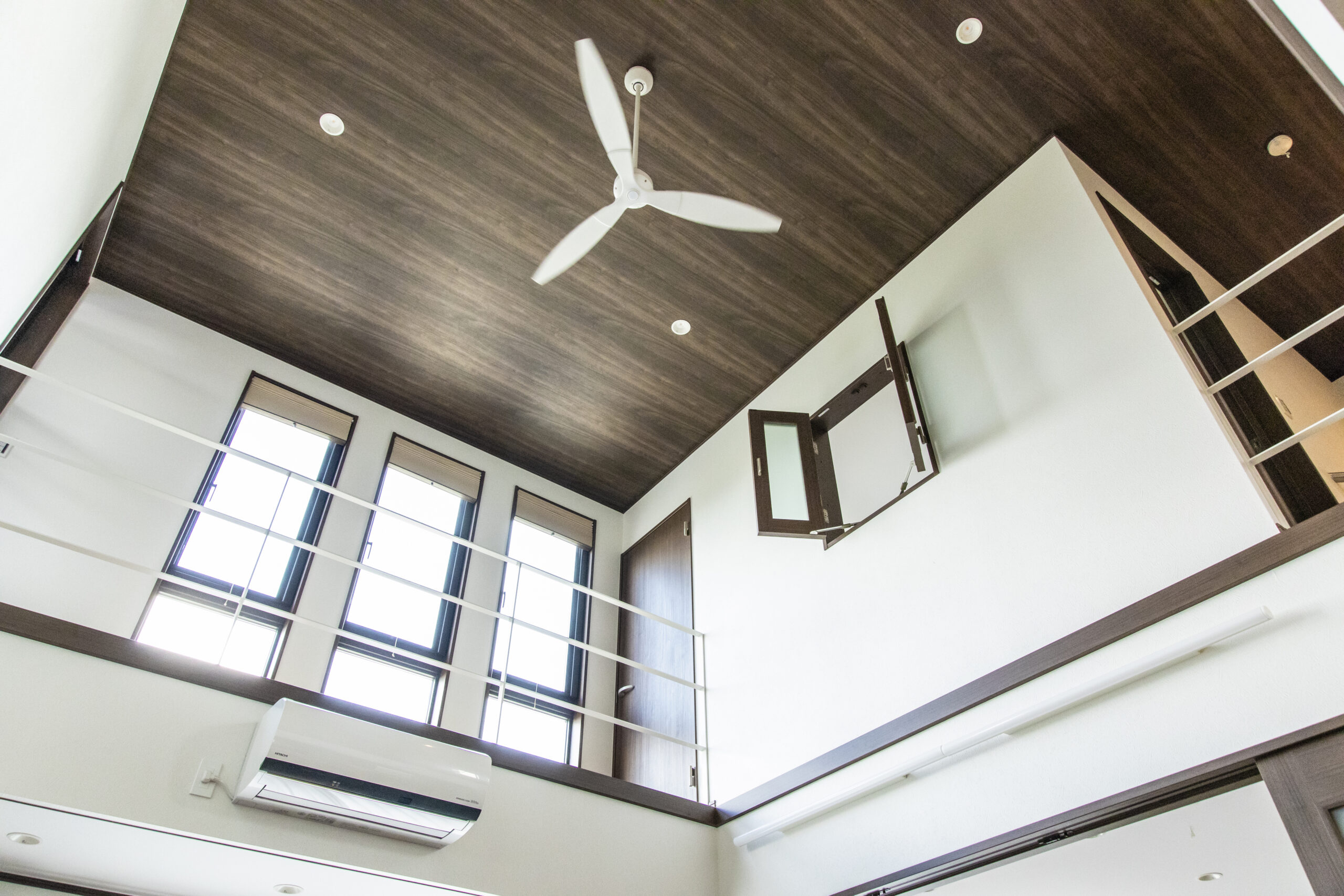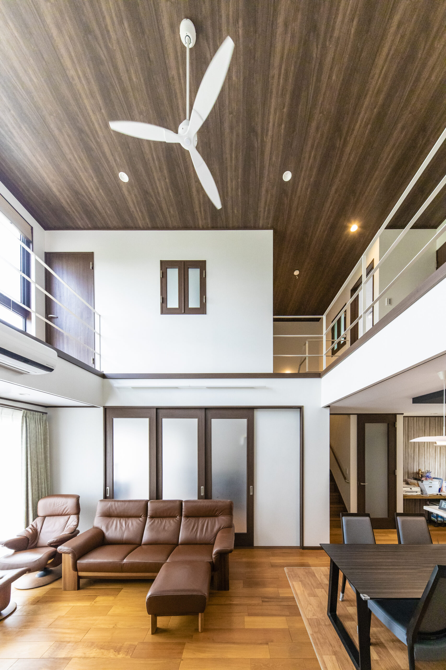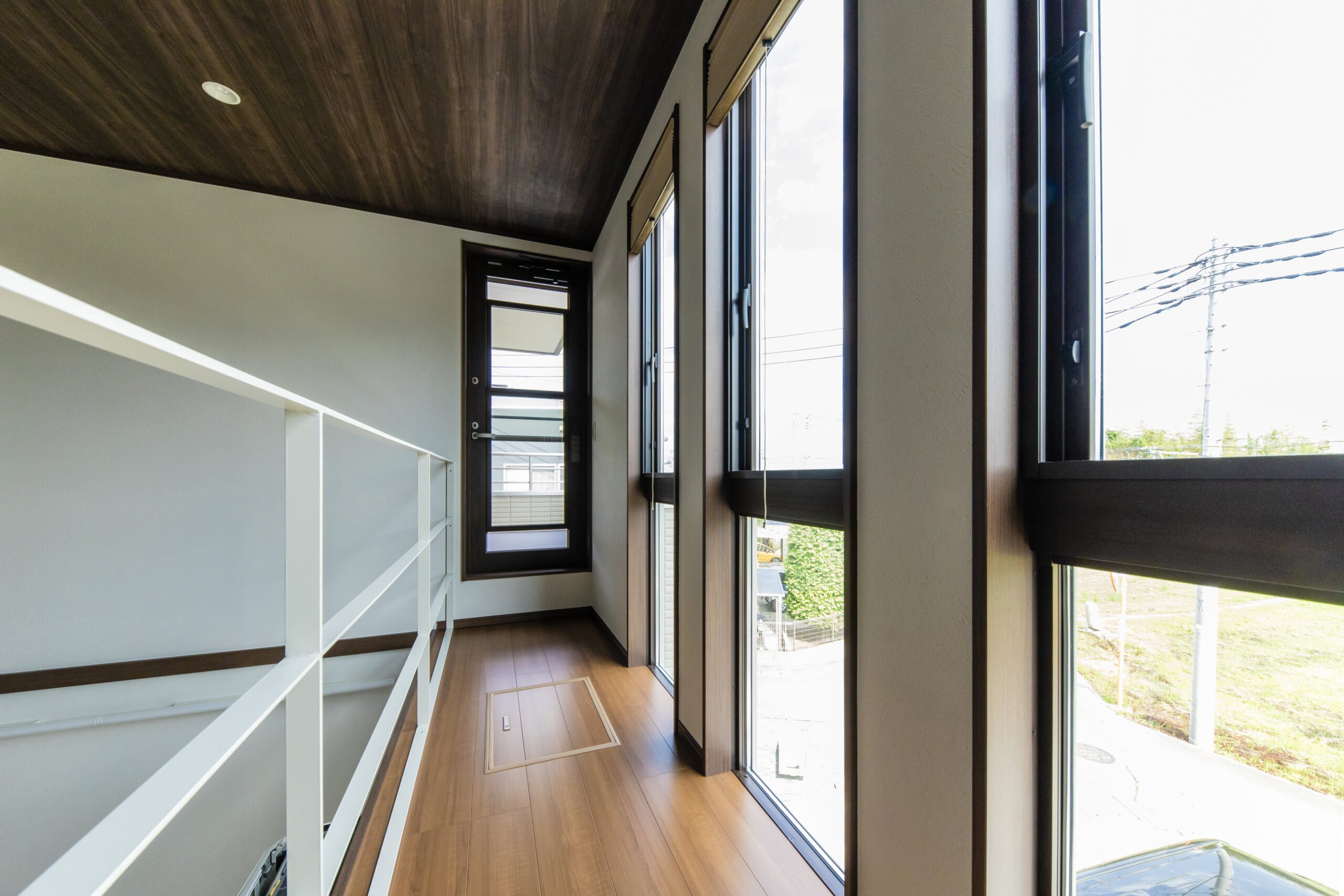 リビングの吹き抜け部分にある2階の廊下はバルコニーに続く日当たりの良いスペースで奥様のお気に入りの場所になっています