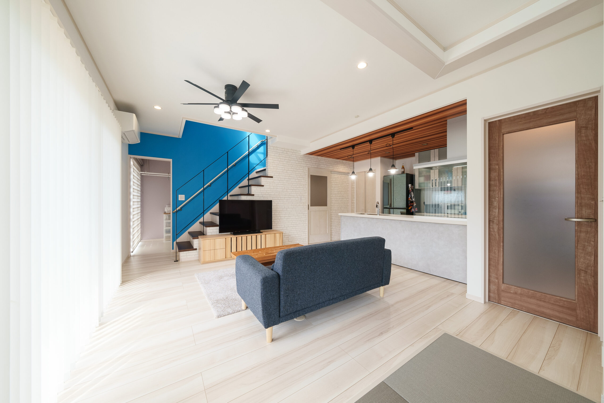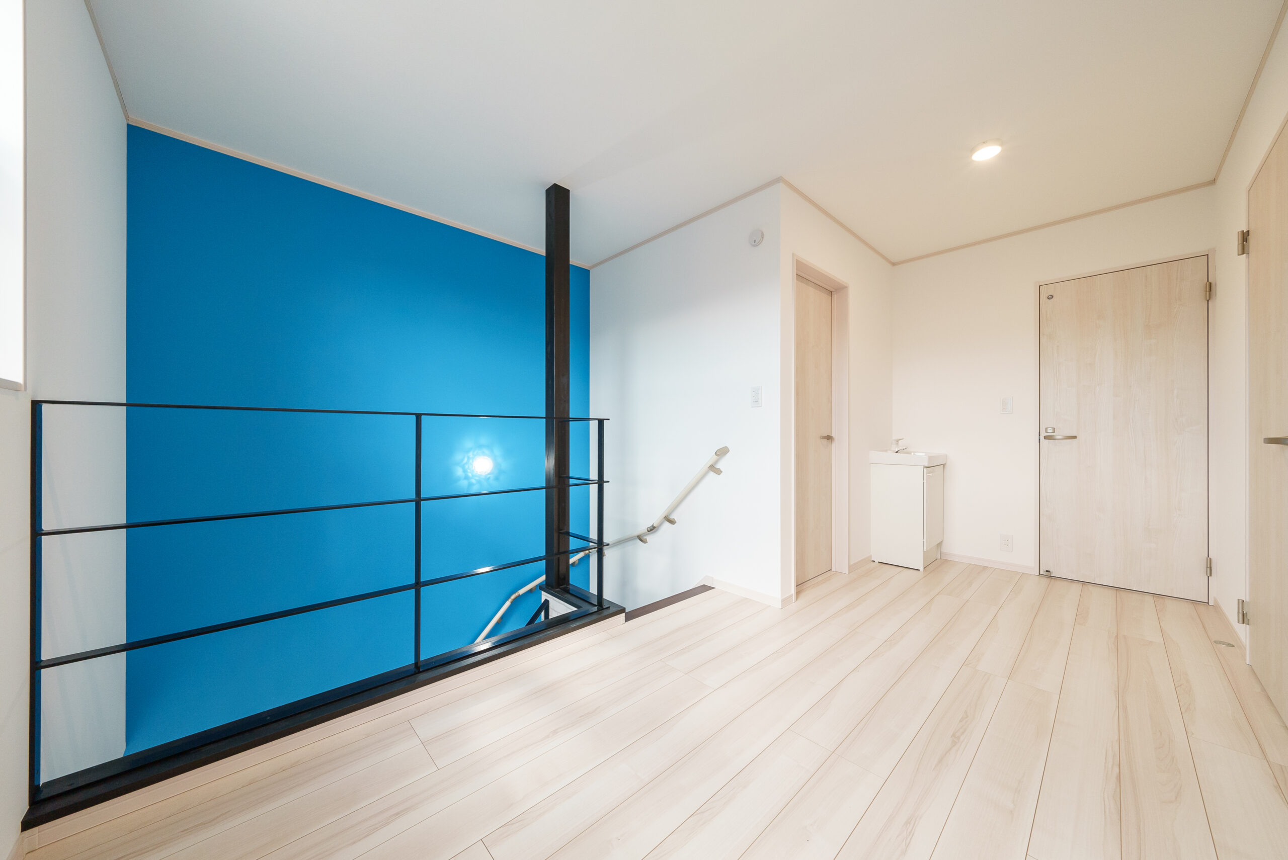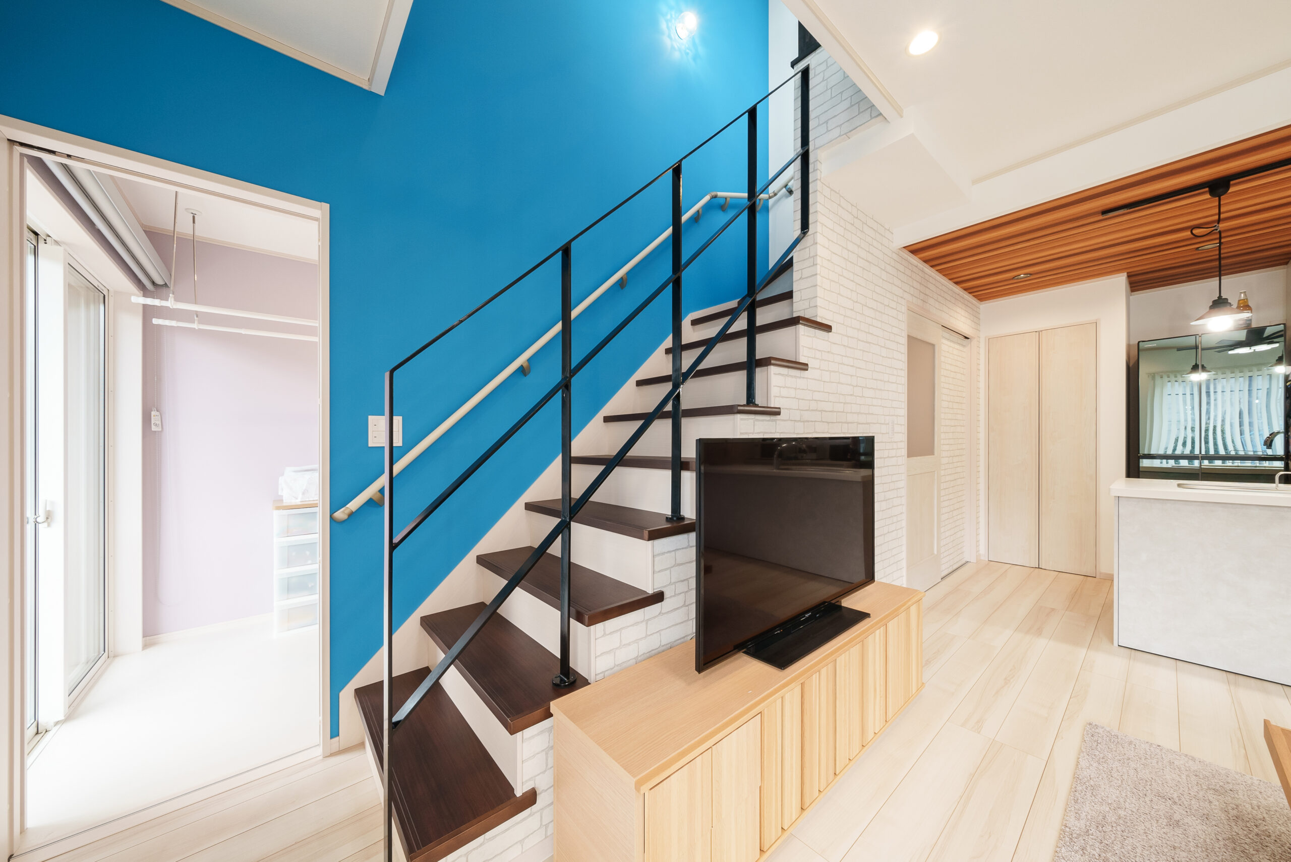 開放感のあるリビング階段、ブルーのクロスがアクセントなっていて爽やかな空間です。