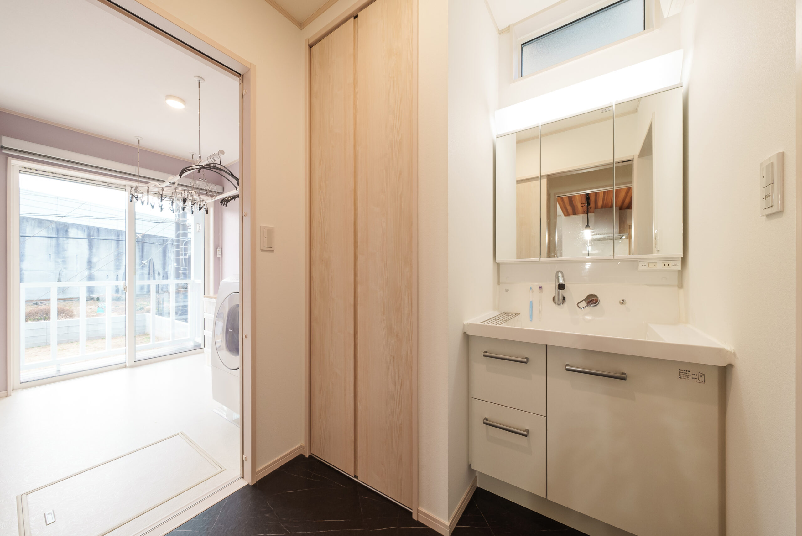 リビング・キッチンから洗面・脱衣スペースさらにランドリースペースに通り抜けられる家事ラク周回動線です。
