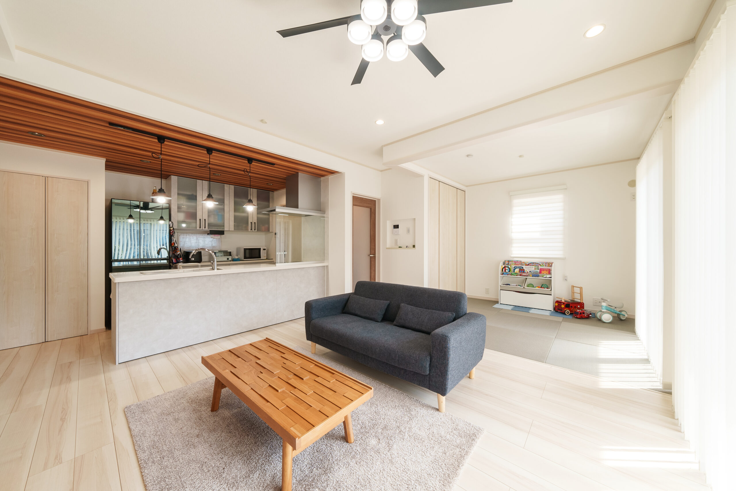 南側は窓を多く配置し、太陽の光が差し込む明るいリビング。一部が畳になっており、のんびりと過ごせる空間です。