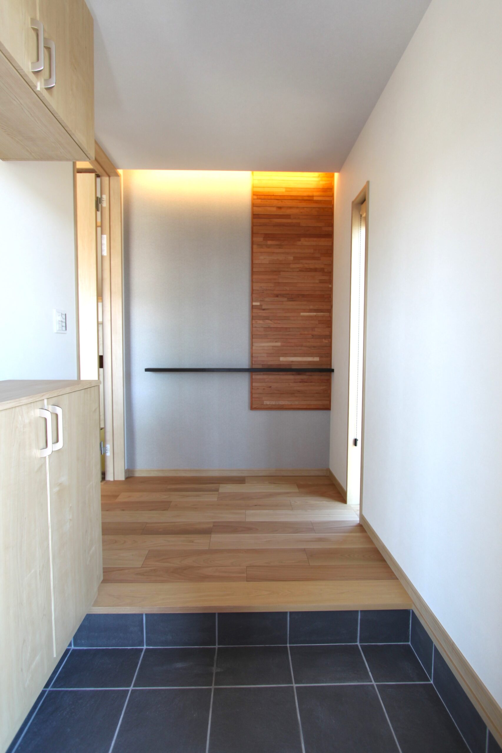玄関扉を開けると間接照明の落ち着いた空間が家族を迎えてくれます。