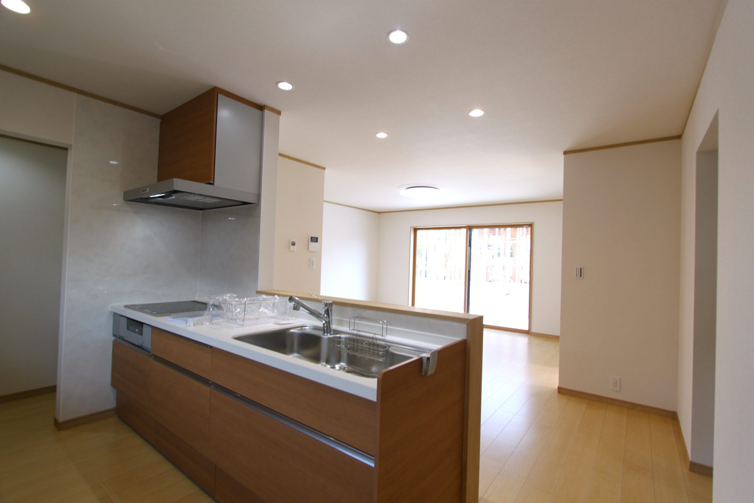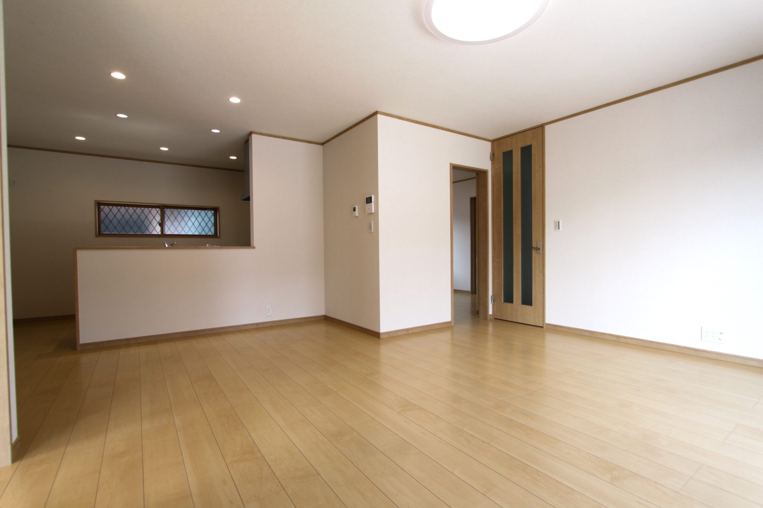 18帖のLDKは南側の大きい窓から明るい光が射し込みます。キッチンの隣のスペースには食品庫を配置し、ストック用の食品も取出しやすくなっております。