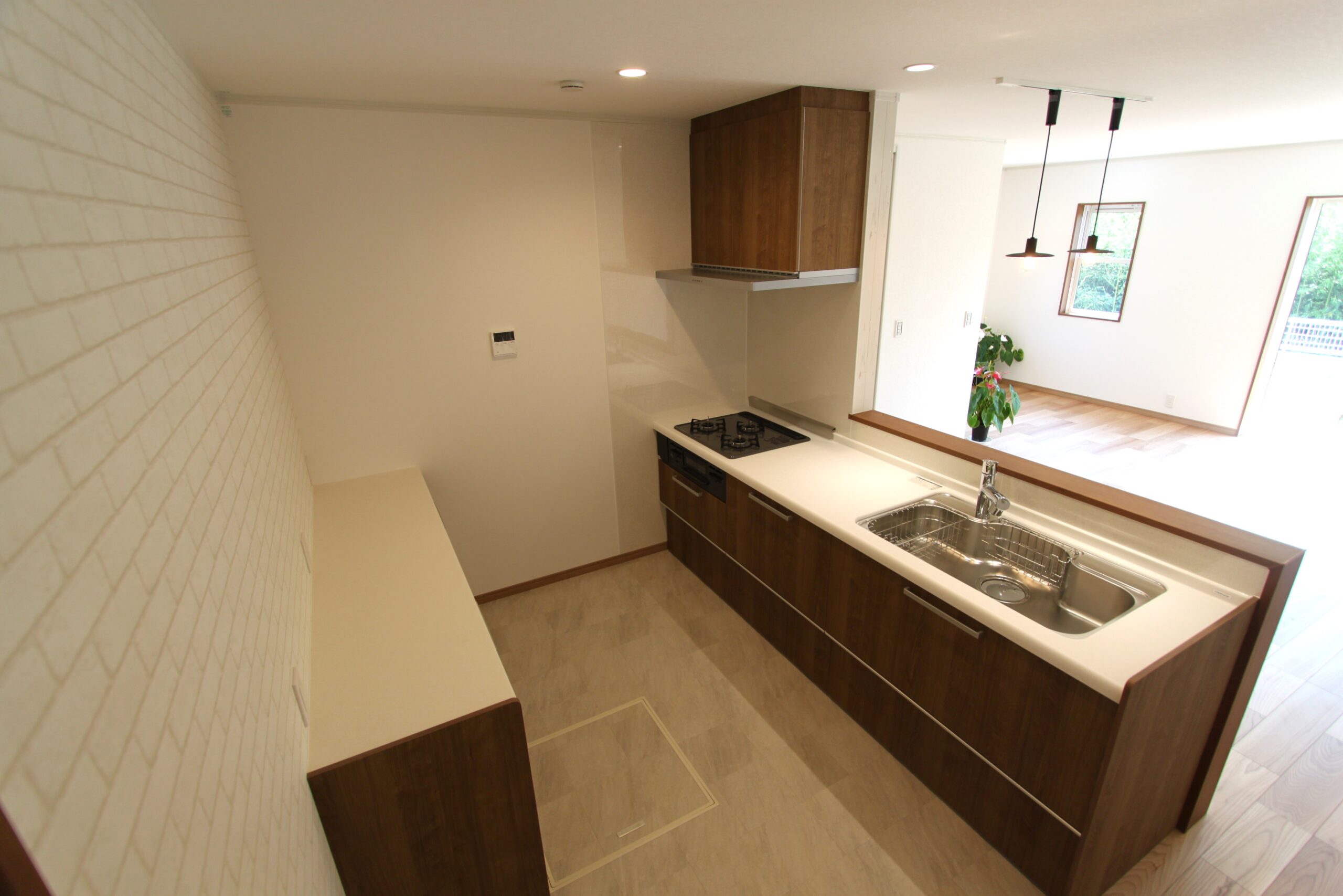 キッチンはレンガ調のアクセントクロスや土間風の柄のフローリング材を使用し、N様のセンスやこだわりが伝わってくる室内。