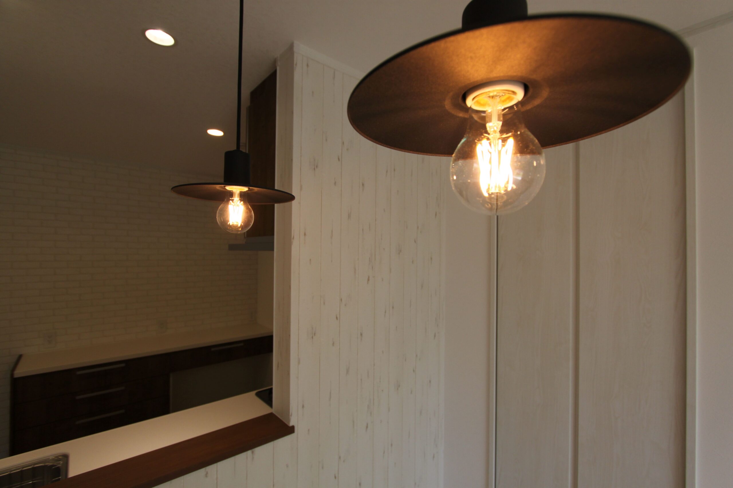 ダイニングテーブル上は食事を美味しく照らしてくれるオシャレな照明を採用