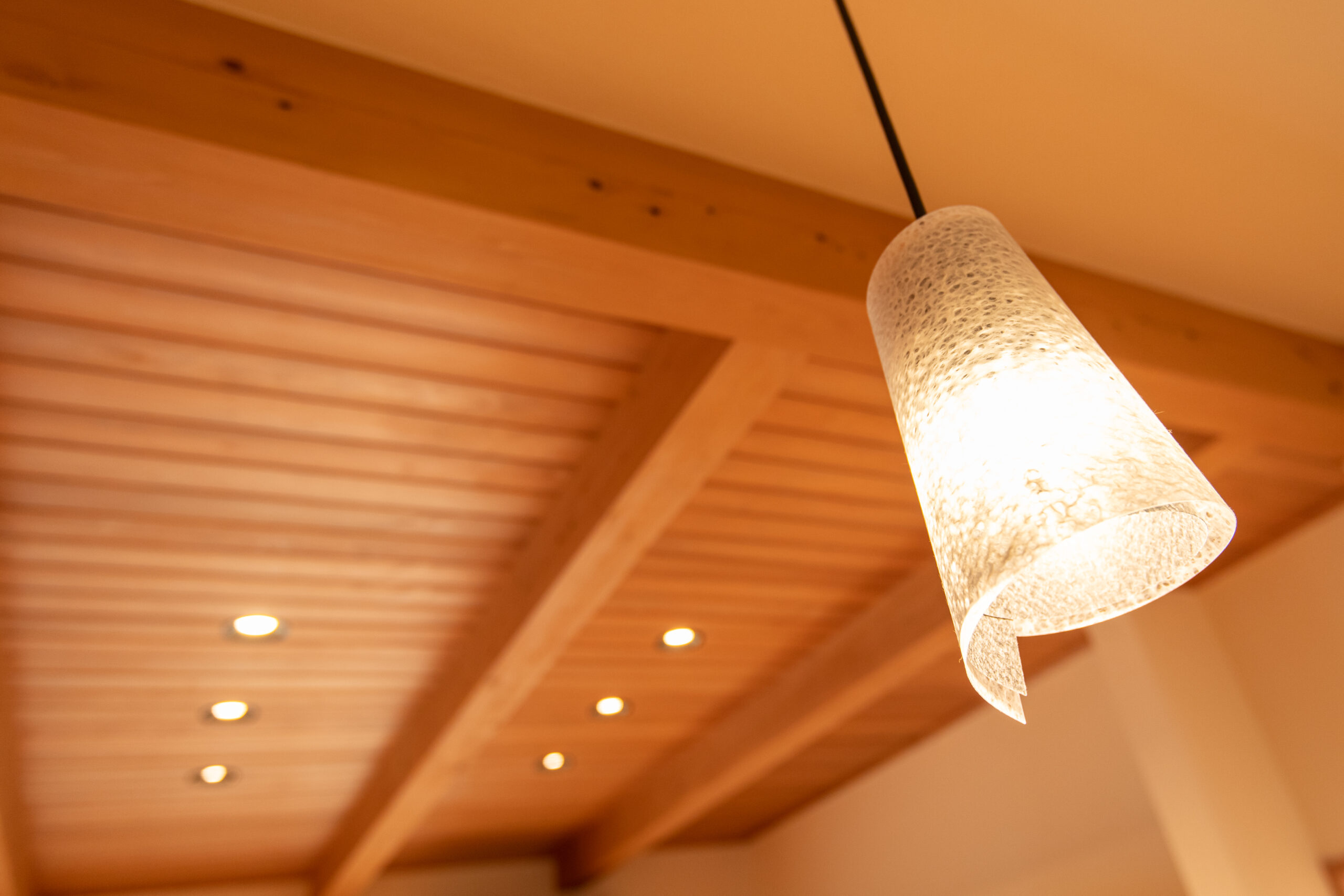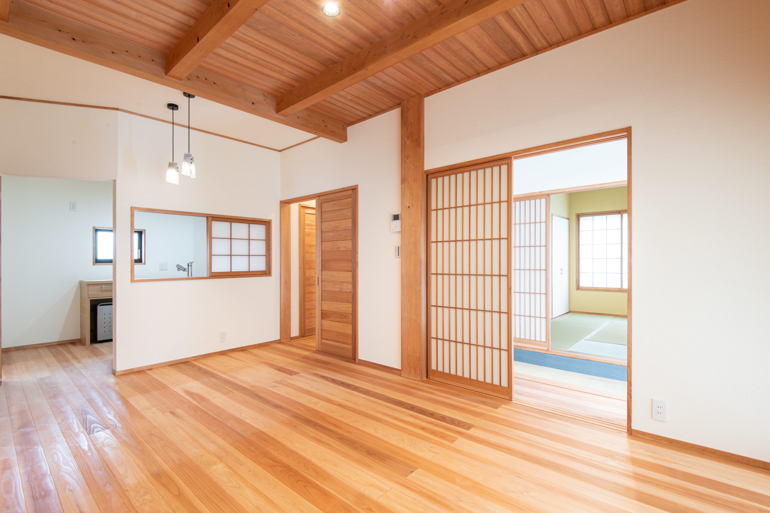 室内に足を運ぶと心地よい木の香りが出迎えます。天井や壁にほたて漆喰を採用したことで「空気が澄んでいるように感じる上質な空間」となっています。