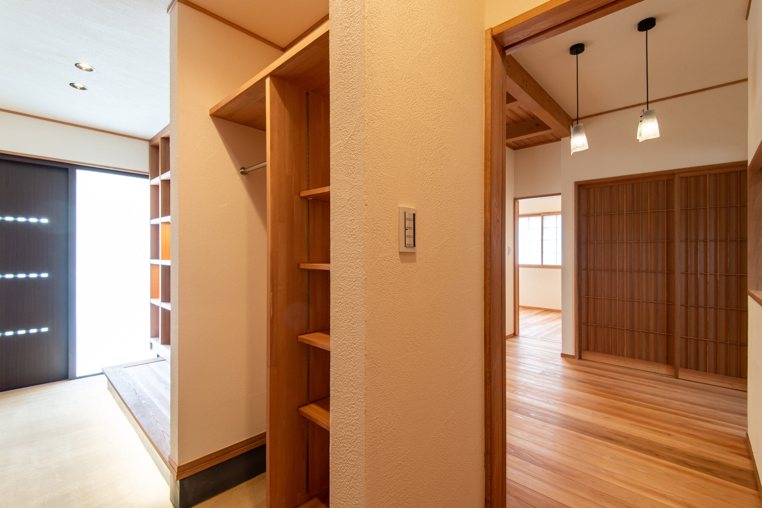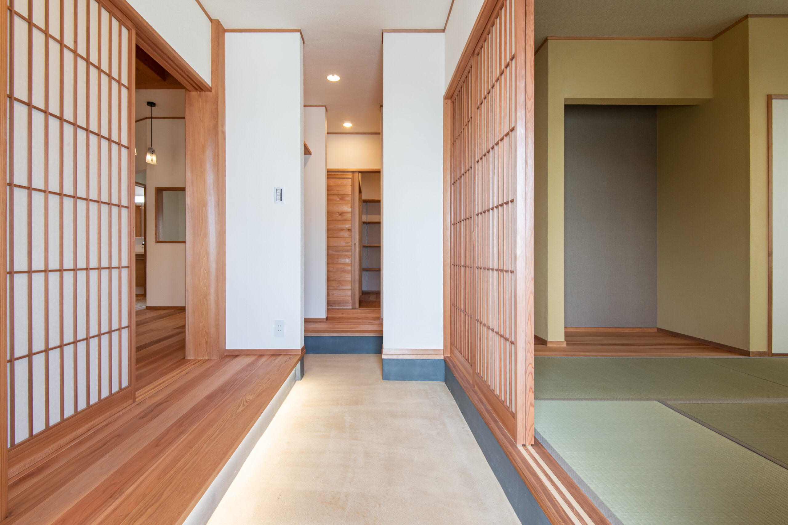 玄関土間を家の中央付近まで延ばしたことで、来客時の対応がスムーズになったり、買い物からの帰宅時に最短距離でキッチンまで行けたりと家族想いのデザインです。