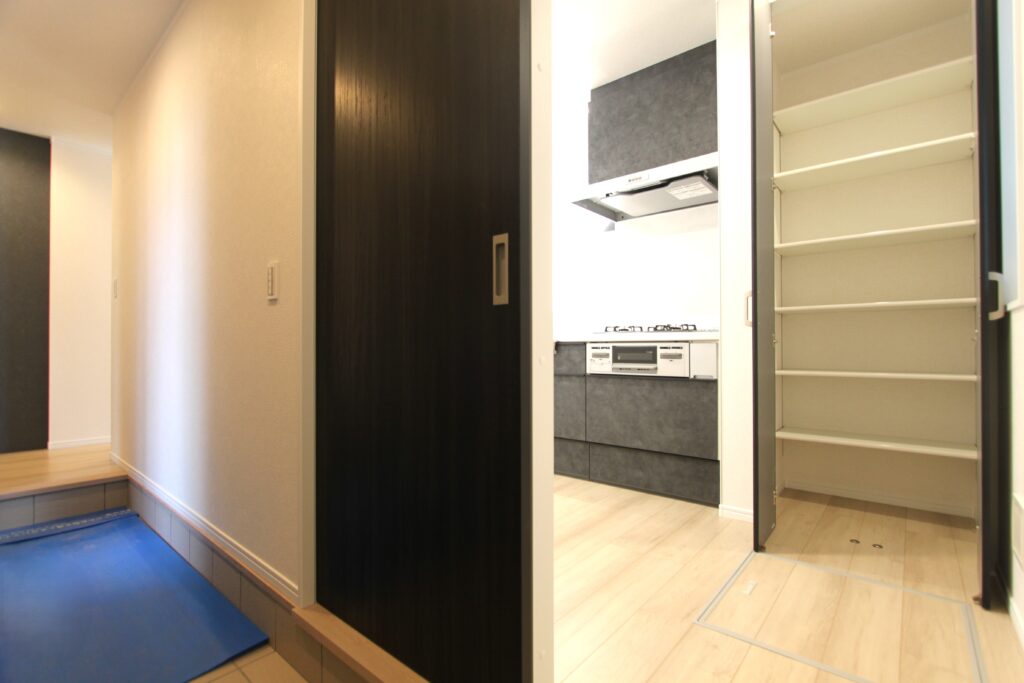 土間収納から靴を脱がずに直接キッチンに荷物を置くことができる間取りは、たくさん買い物をしても持ち運びが安心のアイデア設計です。