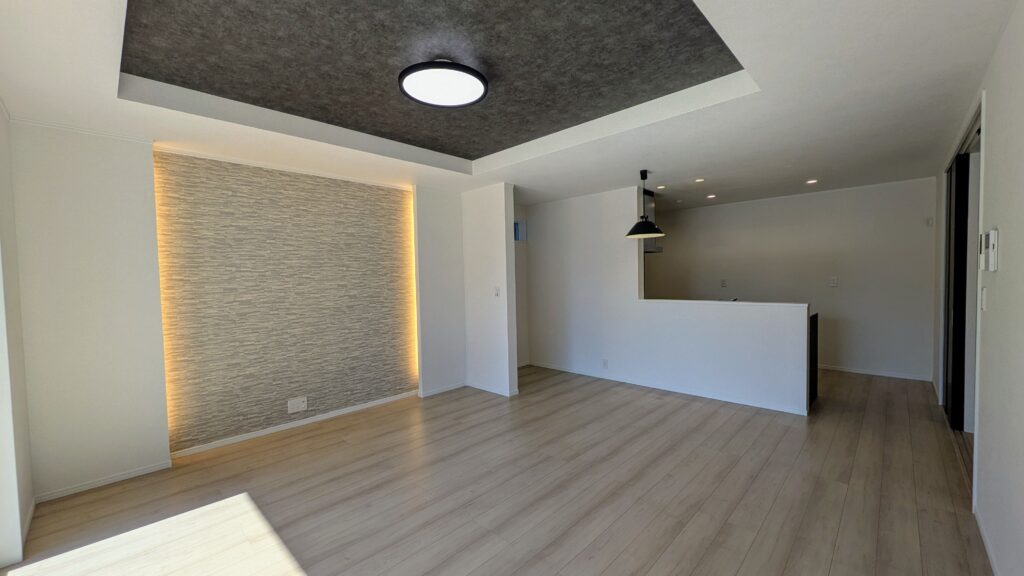 間接照明を採用したリビングは室内をおしゃれな空間に演出してくれます。奥行きを出した設計は空間をより広く感じるポイントです。