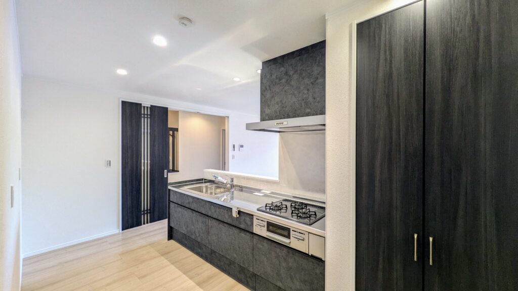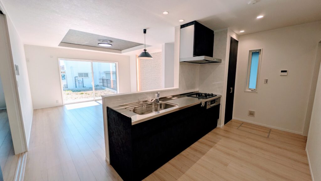 お庭まで見渡せる大きな窓を採用したLDKは家族でゆったり過ごせる広々空間。お料理をしながらでも、室内やお庭で遊ぶ子どもたちを見守ることができる配置です。